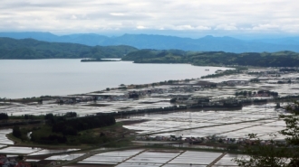 この時期は猪苗代湖の水が溢れたように見えます。標高500mを超えるこの地では苗が伸びるまでこの風景です。